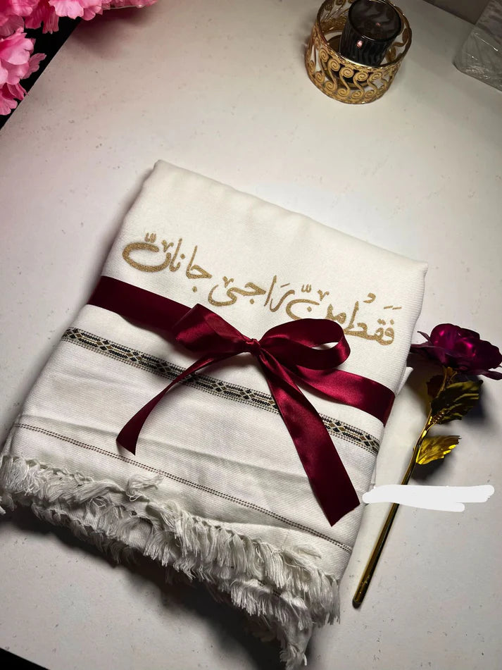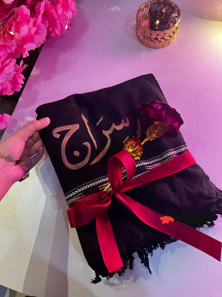 "This elegant and traditional shawl features custom English & calligraphy, designed for cultural occasions such as Eid, Nikah, or gifting."Fabric : Soft Acrylic stuffName painted in english or calligraphyColors : Black and White.